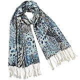 100% Pashmina/Cashmere Blue Leopard Zebra Animal Print Wave Tassel Ends Long Scarf Shawl : Shawl Scarf